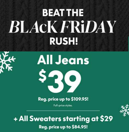 Beat the Black Friday rush! Shop in store and get jeans for $39 + all sweaters starting at $29.