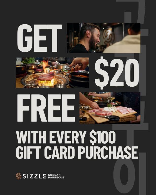 This holiday season, when you buy a $100 gift card, you’ll receive an extra $20 gift card on us. Perfect for the grill lovers, the foodies, and the ones who know a night at Sizzle is always a good idea.