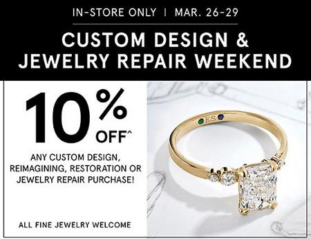 Cannot be combined with any other offers or discounts. Available in store only during the Custom Design & Jewelry Restoration Event when payment is made in full. Custom Design discount cannot be redeemed on loose diamonds and gemstones, previously owned jewelry, protection plans, purchases made with trade-ins, or on previous repairs or services. Any fine jewelry qualifies for this offer - we work on all gold, platinum, and sterling silver jewelry. Applicable on in-store care, repair or custom design services only. See Jewelry Expert for details. Offer valid through 03/29/26.