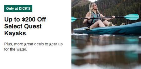 Super savings! Shop in-store and receive up to $200 off on select Quest kayaks. Plus, more great deals to gear up for the water.
