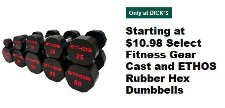 Starting at $10.98 Select Fitness Gear Cast and ETHOS Rubber Hex Dumbbells